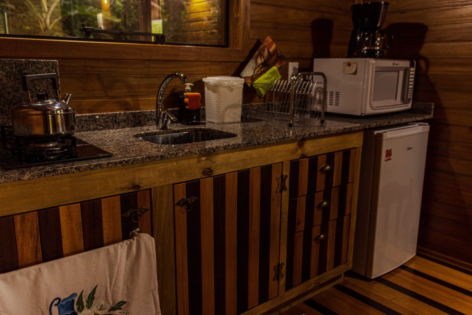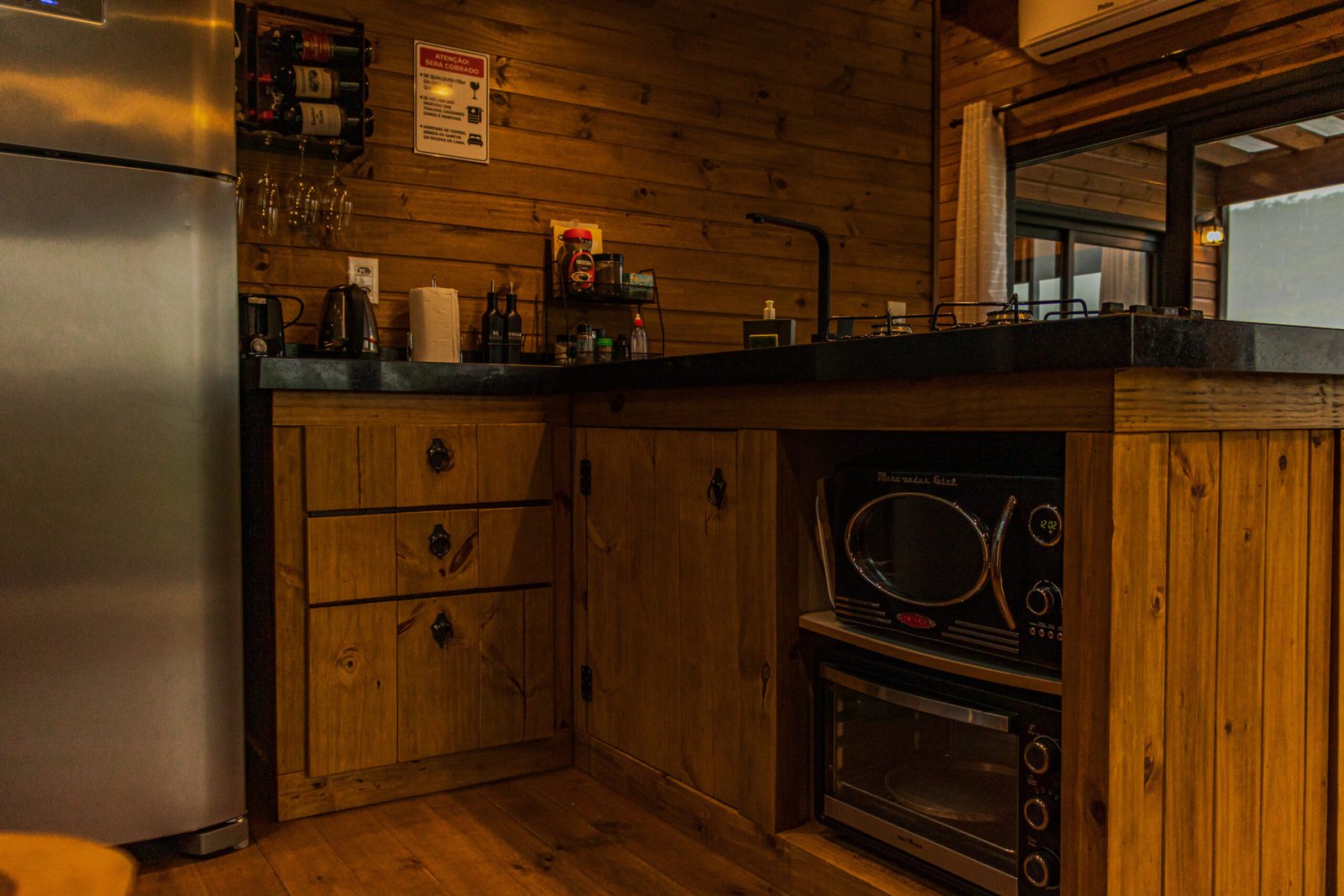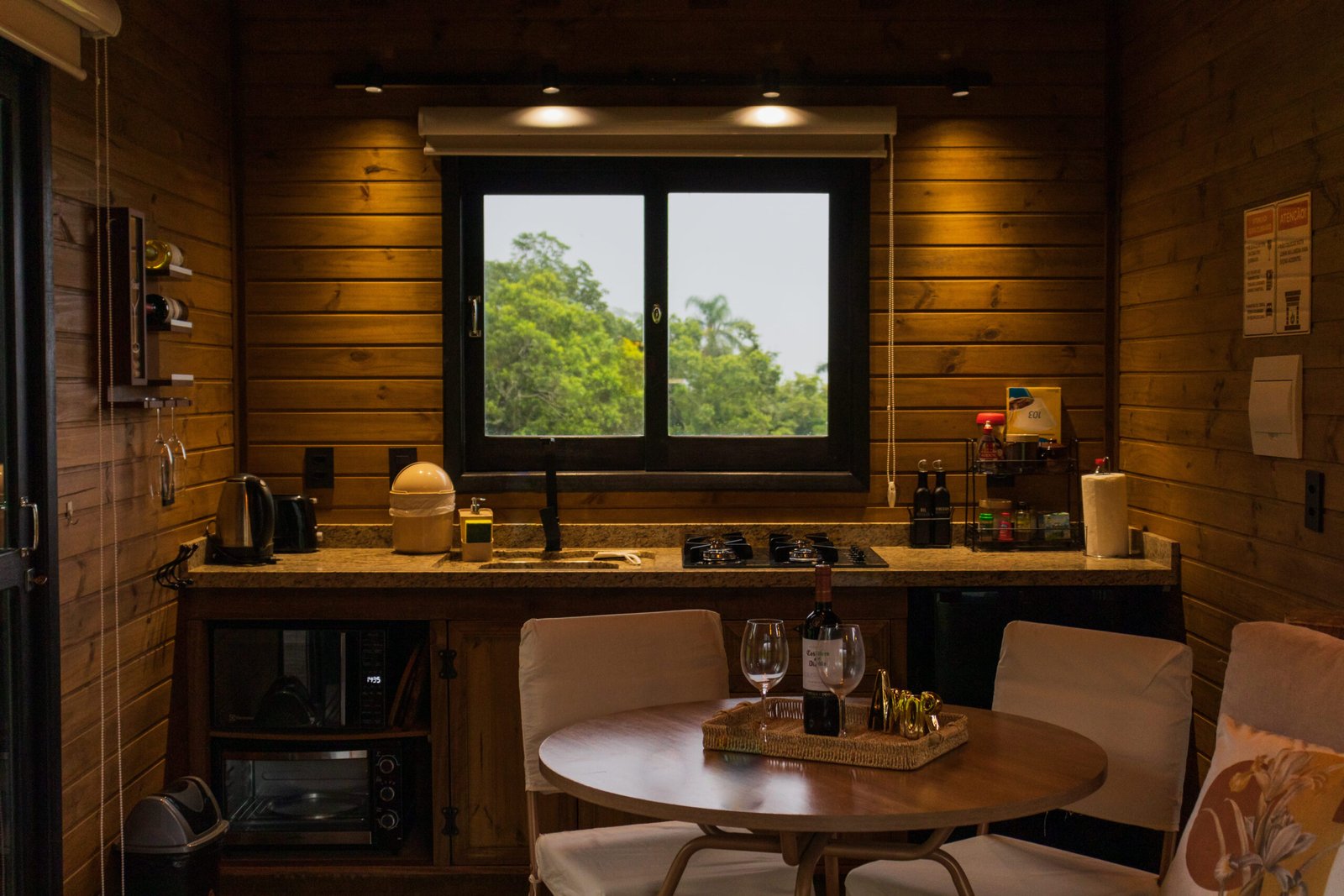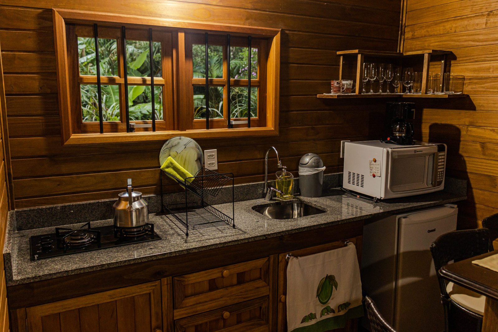 Frigobar, fogão, forno elétrico, micro-ondas e utensílios sofisticados, incluindo taças de vinho e espumante de cristal, para que você possa preparar refeições especiais.